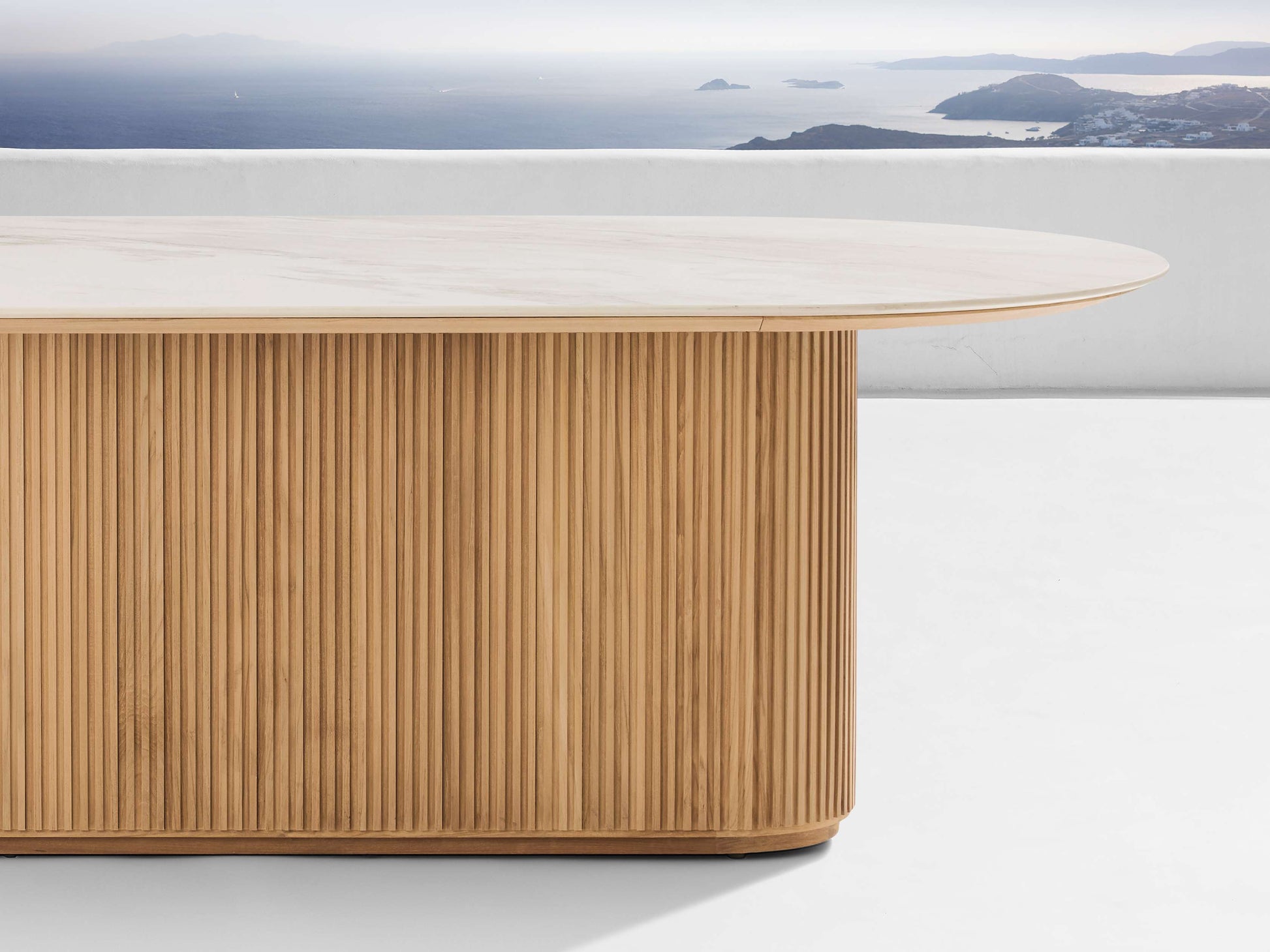 Tables are complemented by sintered stone tops comprised of natural materials that are heat pressed to ensure a flat, nearly poreless surface that is scratch-, stain-, and heat-resistant.